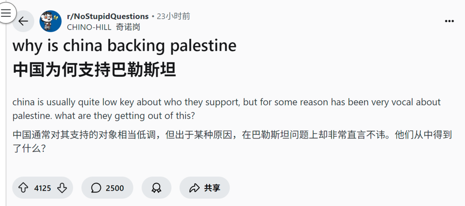 来源:https://www.reddit.com/r/NoStupidQuestions/comments/1nryada/why_is_china_backing_palestine/