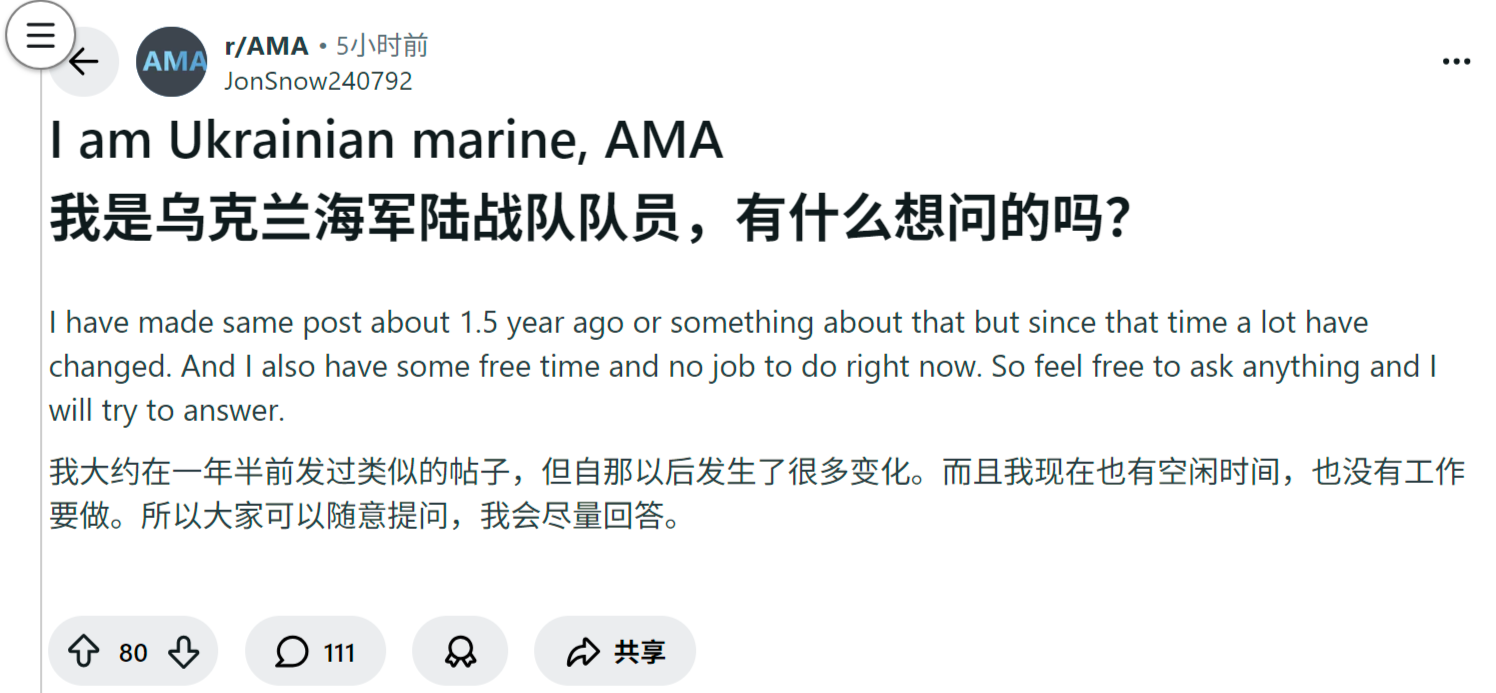来源:https://www.reddit.com/r/AMA/comments/1ojv4qn/i_am_ukrainian_marine_ama/