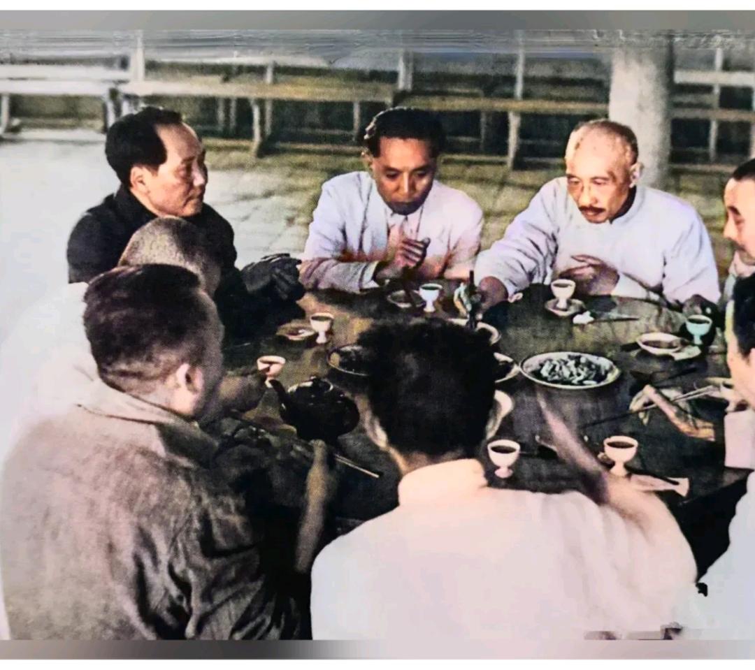 1945年7月1日,6位国民参政员褚辅成、黄炎培、冷遹、傅斯年、左舜生、章伯钧从重庆飞抵延安进行访问和考察“窑洞对”。左起:毛泽东、章伯钧、冷遹(冷御秋)黄炎培、诸辅助成、左舜生、 朱德、傅斯年