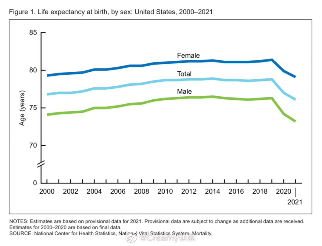 苏联解体后的10年,俄罗斯人均寿命下降了大约3岁。 美国更牛逼,2020年加上2021年仅仅两年,人均寿命就下降了3岁。 中国也是大概从2019年开始超过美国,到现在比美国快高两岁。