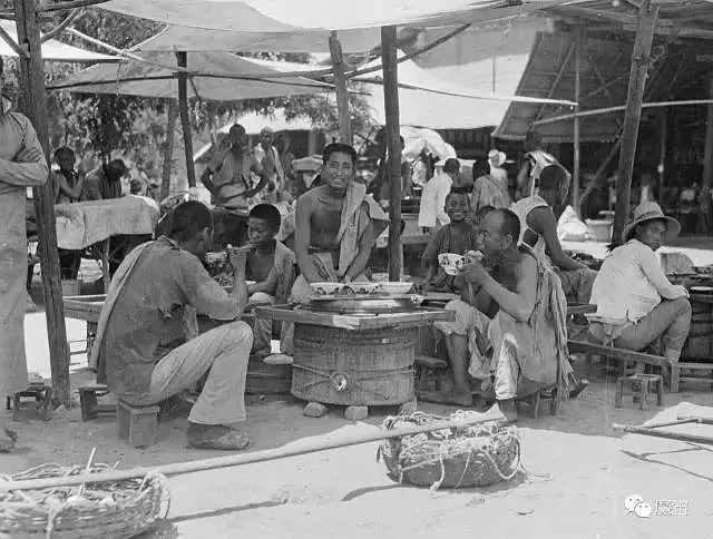 劳动者在凉棚下吃饭。拍摄地点:北京,拍摄时间:1917-1919年。