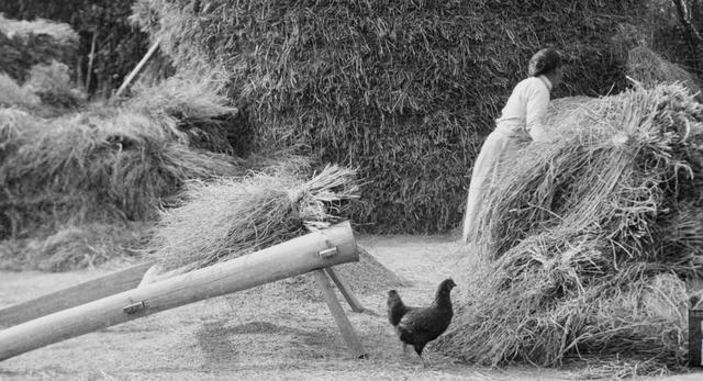 农妇打谷图。民国时期自然没有打谷机。那时候打谷还是最原始的方式,立一个三角形的架子,然后倒持稻草,将有谷穗的一头甩向立架。谷穗纷纷坠落。往往甩许多下才能保证谷穗全部掉落,是个十分辛苦哦的活。
