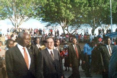 随后,他在莫伊的陪同下,与各国驻肯使节及欢迎群众见面。身穿各式服装的肯尼亚妇女载歌载舞,欢迎江同志一行的到来。他频频向欢迎群众招手致意。欢迎仪式结束后,他在机场贵宾厅的签名簿上签名,随后由莫伊总统陪同前往下榻的饭店。