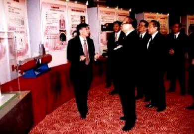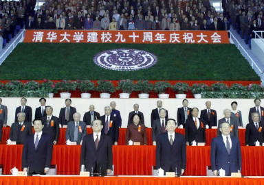 2001年4月29日,江同志等参加清华大学90周年校庆典礼。他听取了学校的工作汇报,对清华大学取得的成绩表示祝贺,希望清华大学朝着具有世界先进水平的一流大学的目标不懈努力。并亲切接见了出席庆祝大会的费孝通(左一)、钱伟长(左二),还兴致勃勃地参观了学校科技成果展览。参观过程中,他仔细听取了王大中校长的介绍,饶有兴致地观看了具有我国自主知识产权的数字电视发射与接收系统及其专用芯片、长达500米的高温超导线材、生物材料等实物,了解了中国教育科研网、低温供热堆应用、全光通信的情况。当听到许多科研成果已经达到世界先进水平时,十分高兴。他希望清华大学继续发扬创新精神,勇于探索,为发展我国的科技事业、培养高素质的人才作出新的贡献。