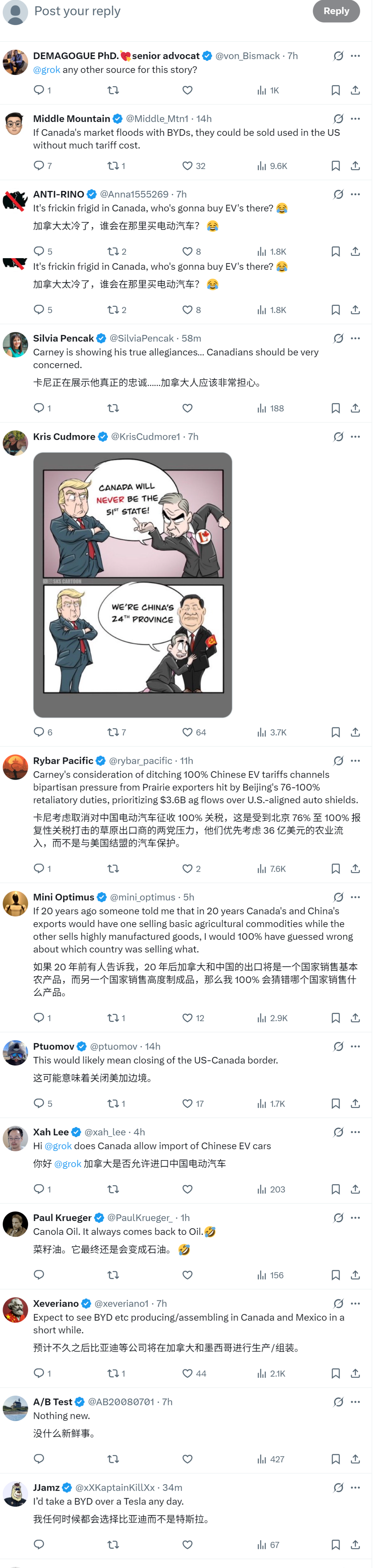 加拿大与美国关系出现重大分歧,正考虑取消对中国电动汽车的关税,以换取中国取消对加拿大猪肉和油菜籽的关税。作者:@eliotcxchen