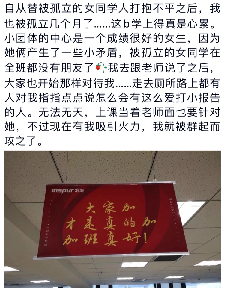 有一段时间没上这个网,我听了同志们的建议去反抗校园暴力了。但是目前还没什么成果,不想理事的人太多了,从众去孤立那个女同学的人占据上风……我想问问同志们有没有什么建议。我们已经高三了,一月份要一模,那个女同学日子更不好过