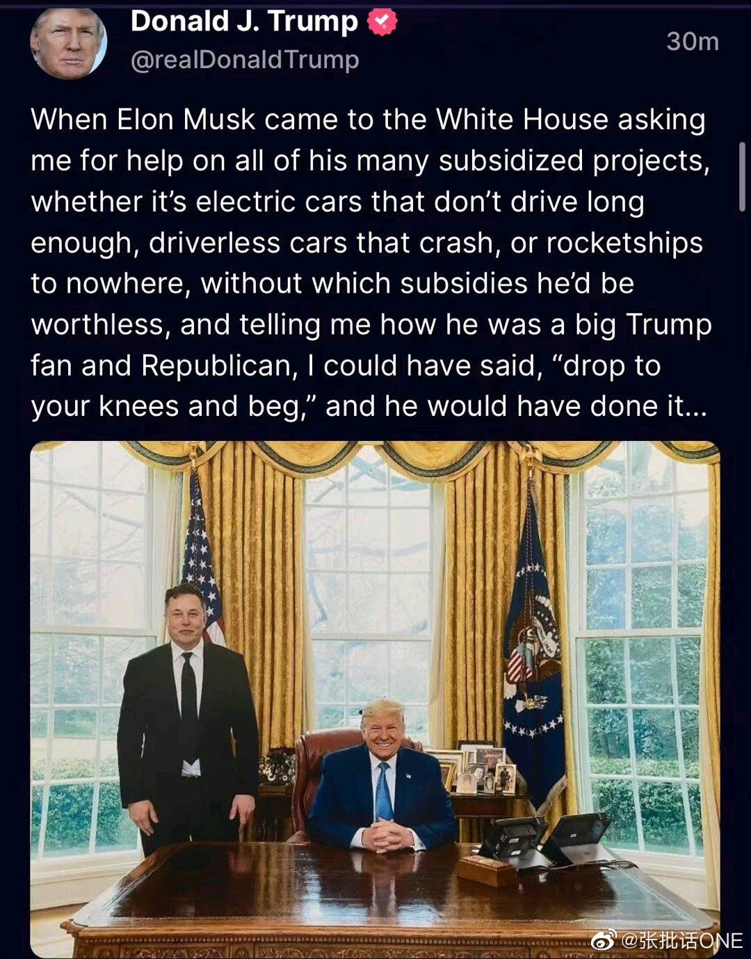 特朗普回应马斯克批评他重新参加美国总统大选的言论 "当埃隆-马斯克来到白宫,乞求我为他的许多项目提供补贴,无论是走不了多远的电动汽车、出了事故的无人驾驶汽车,还是不知去向的火箭飞船,因为没有补贴,他什么都不是;当他告诉我他是特朗普和共和党的多么大的粉丝时,我只要说'跪下来求',他就会照办......"