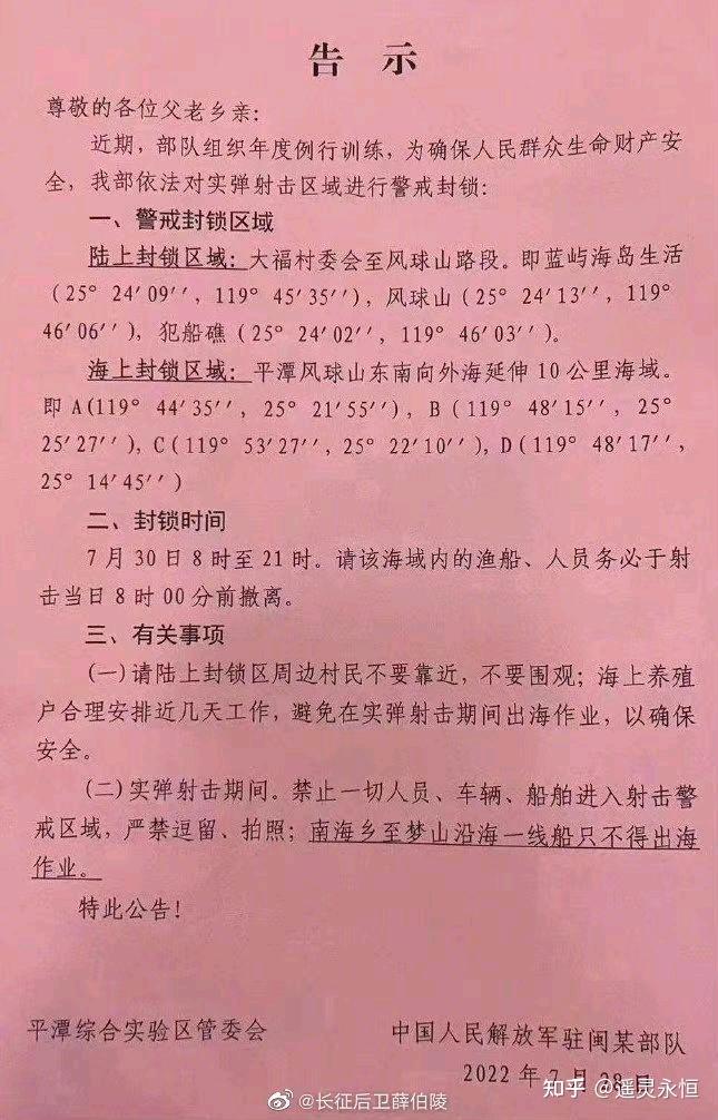 7 月 30 日 8 时至 21 时,福建平潭一岐屿附近水域执行实弹射击训练任务。形势很危机了。有火药桶的感觉。