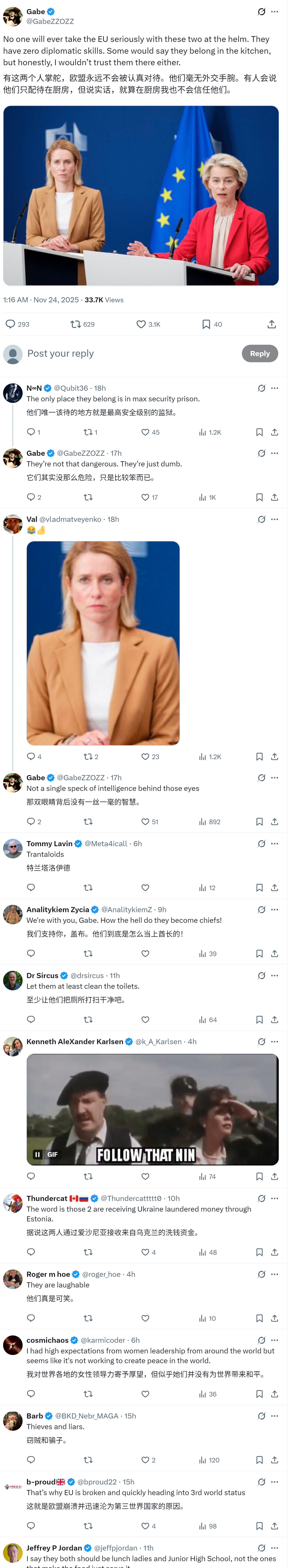 有这两个人掌舵,欧盟永远不会被认真对待。他们毫无外交手腕。有人会说他们只配待在厨房,但说实话,就算在厨房我也不会信任他们。