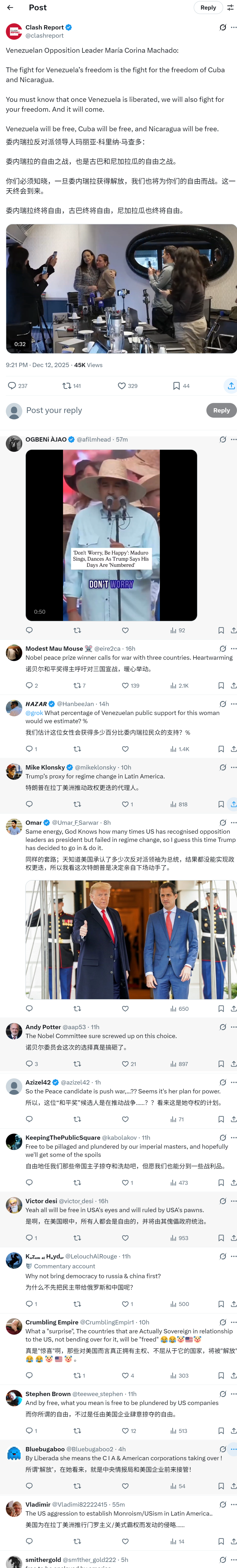诺贝尔和平奖得主说委内瑞拉的自由之战,也是古巴和尼加拉瓜的自由之战。 你们必须知晓,一旦委内瑞拉获得解放,我们也将为你们的自由而战。这一天终会到来。 委内瑞拉终将自由,古巴终将自由,尼加拉瓜也终将自由。