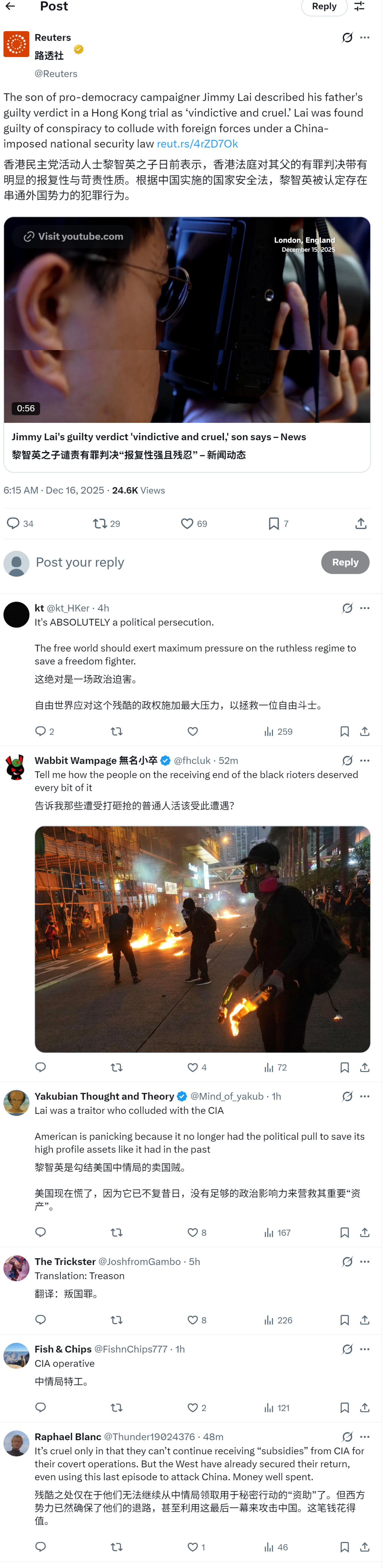 推特上一大堆像蓬佩奥之类政治人物施压中国释放黎智英。