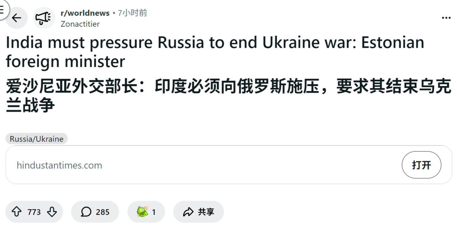 来源:https://www.reddit.com/r/worldnews/comments/1pwcduu/india_must_pressure_russia_to_end_ukraine_war/