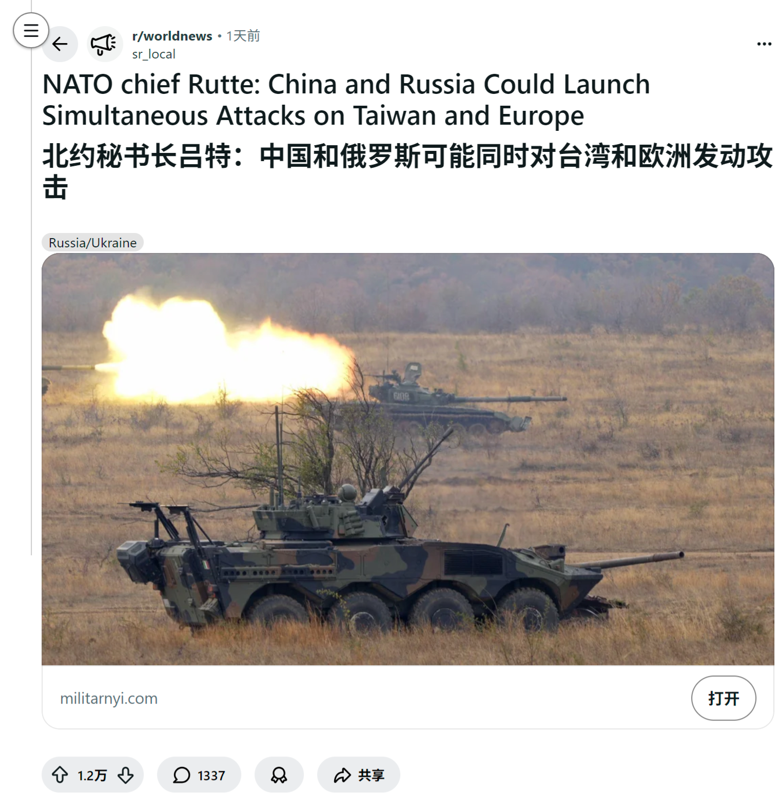 reddit热议 北约秘书长吕特:中国和俄罗斯可能同时对台湾和欧洲发动攻击
