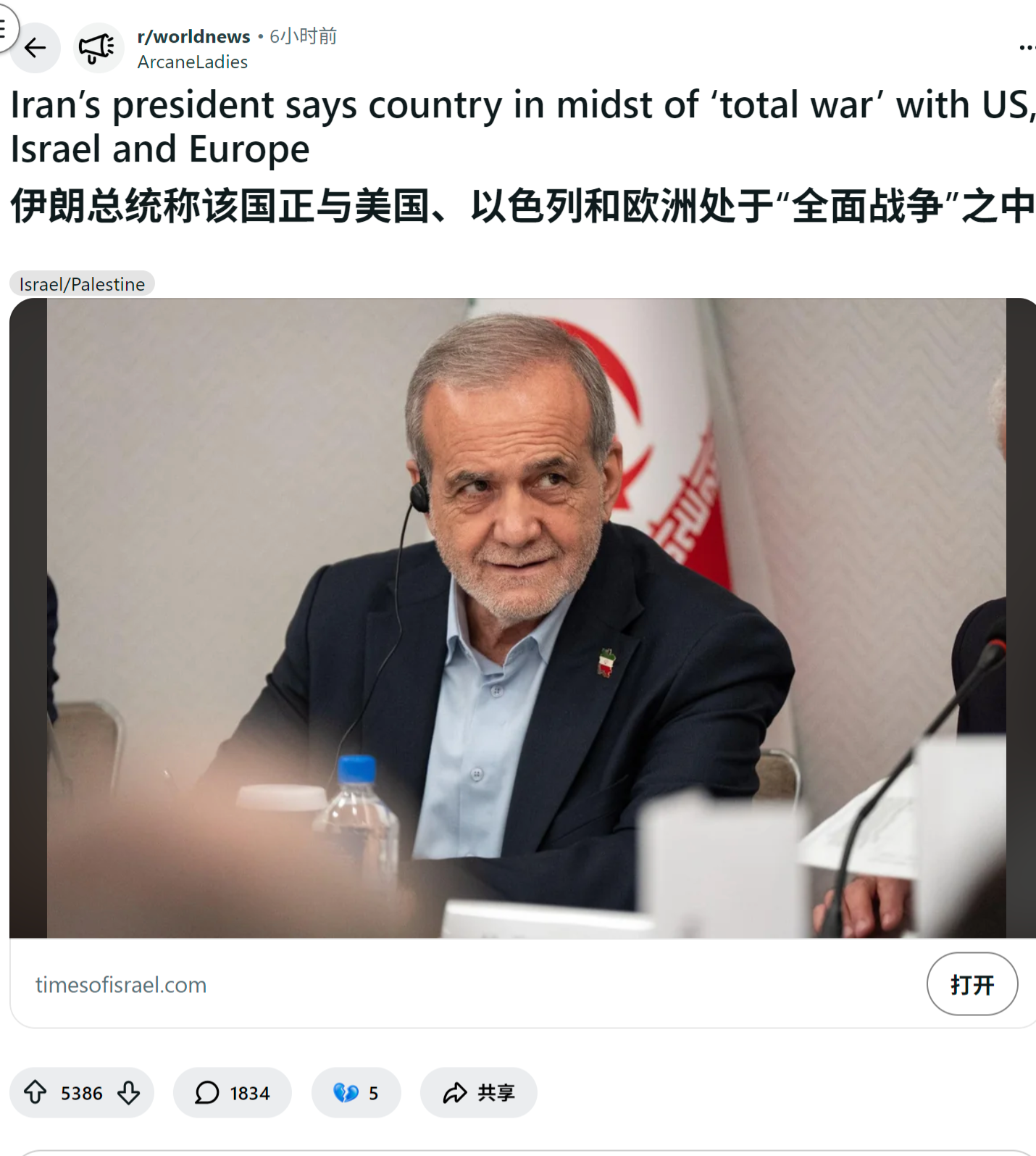 reddit爆火 伊朗总统称该国正与美国、以色列和欧洲处于“全面战争”之中