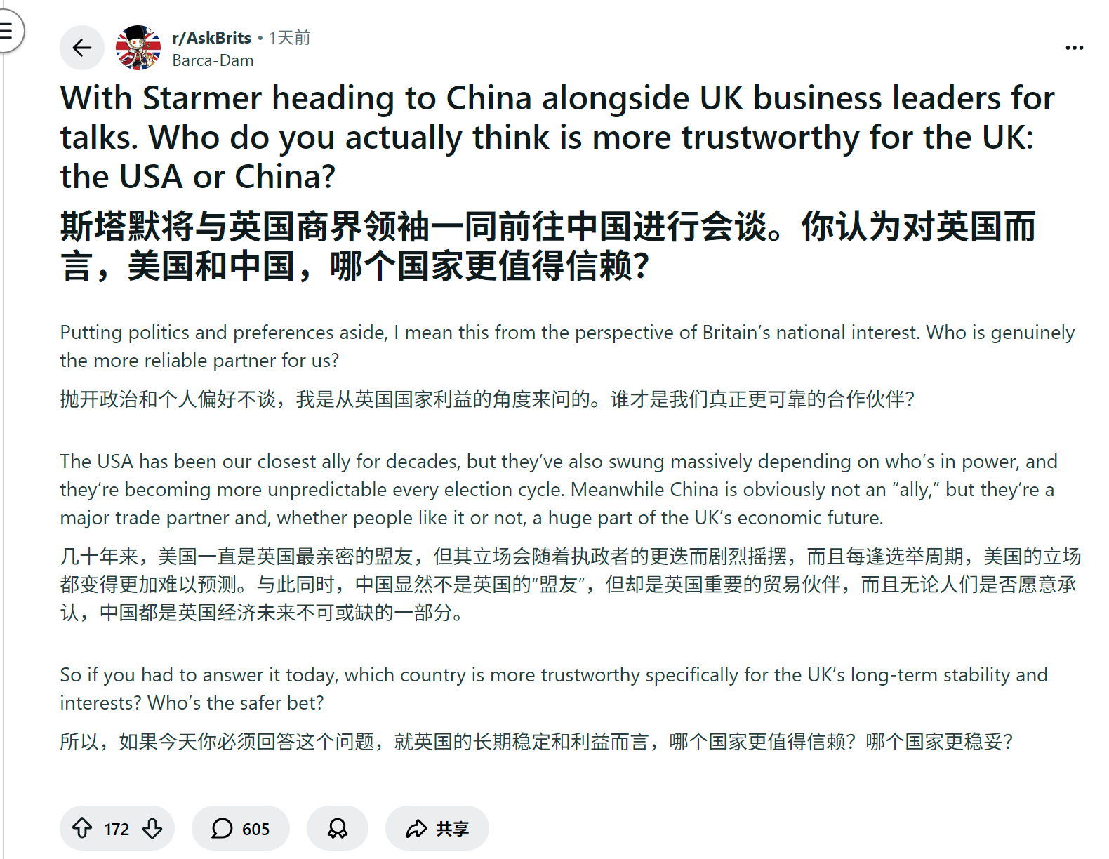 来源:https://www.reddit.com/r/AskBrits/comments/1qivm4y/with_starmer_heading_to_china_alongside_uk/