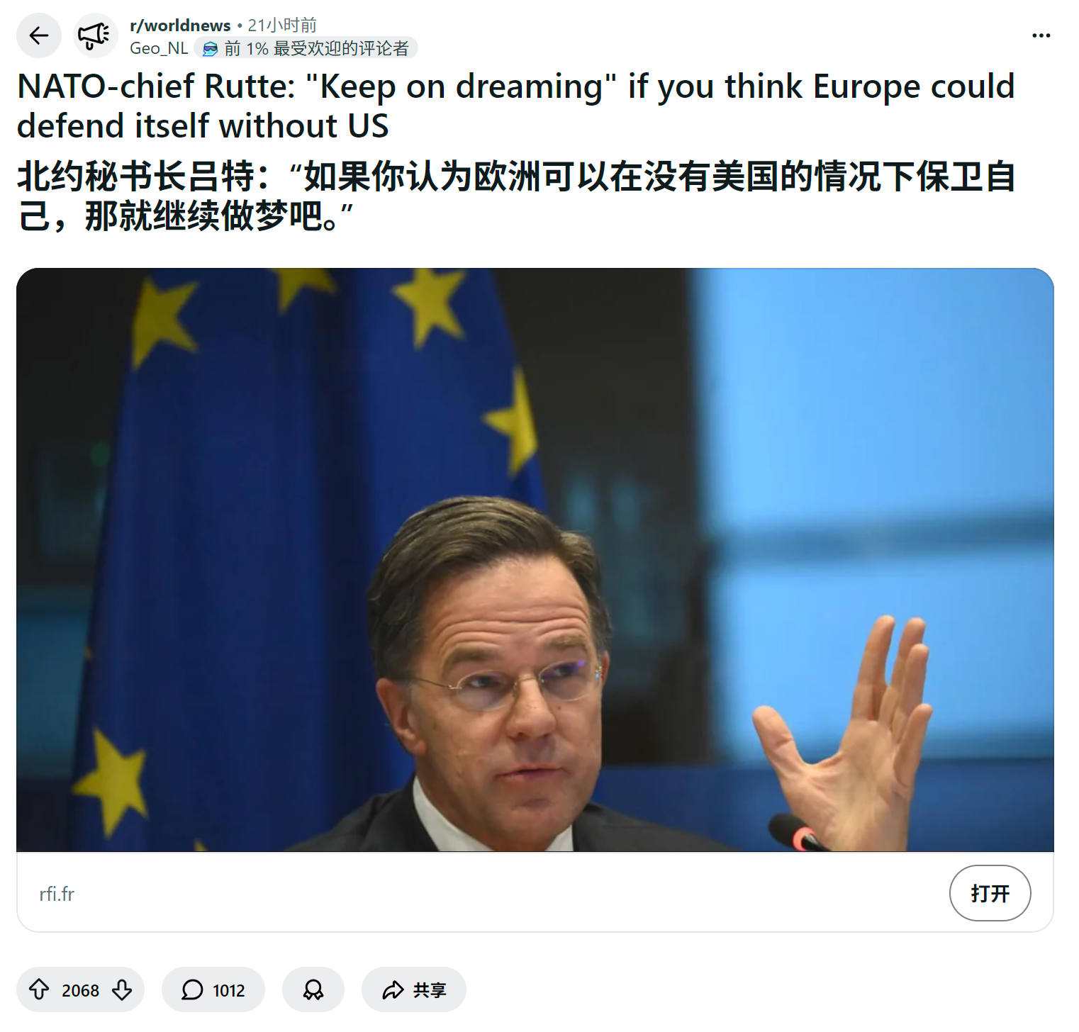 reddit热议 北约秘书长吕特:“如果你认为欧洲可以在没有美国的情况下保卫自己,那就继续做梦吧。”