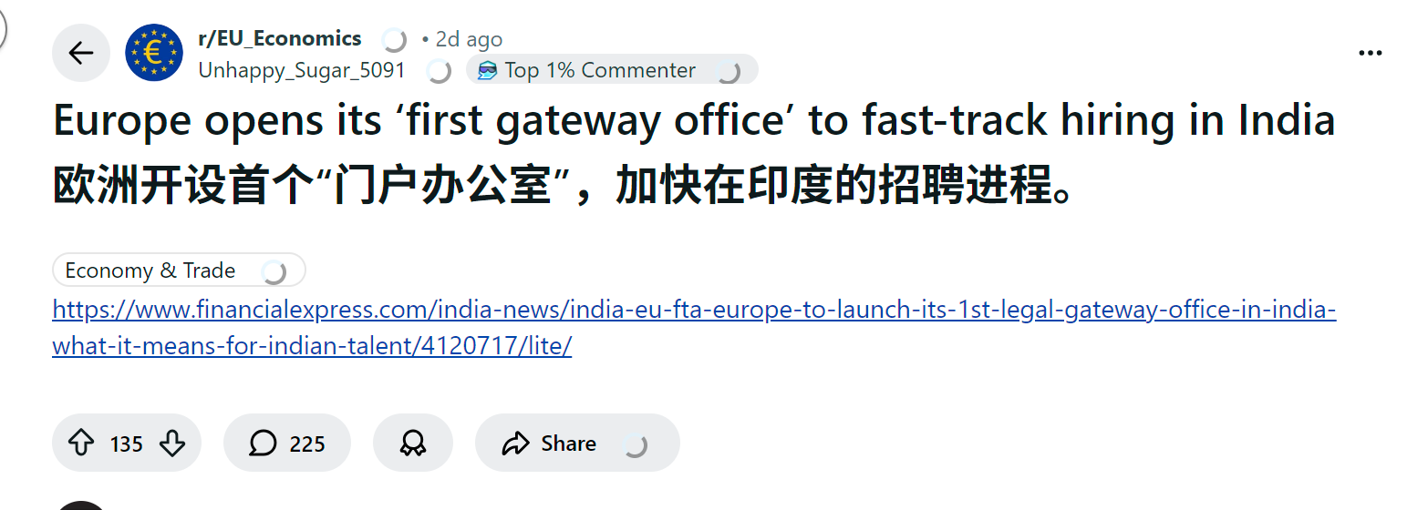 reddit热议 欧洲人怎么看欧洲开设首个“门户办公室”,加快在印度的招聘进程。