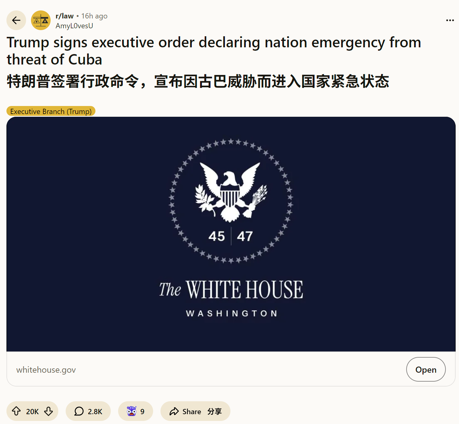 - reddit热议 美国人怎么看特朗普返回华盛顿期间预言古巴将走向灭亡,警告哥伦比亚,并威胁格陵兰岛。