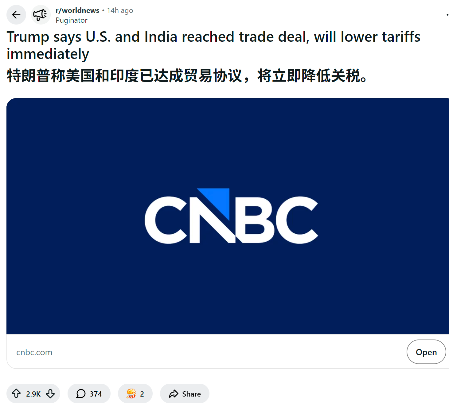 reddit热议 特朗普称美国和印度已达成贸易协议,将立即降低关税。