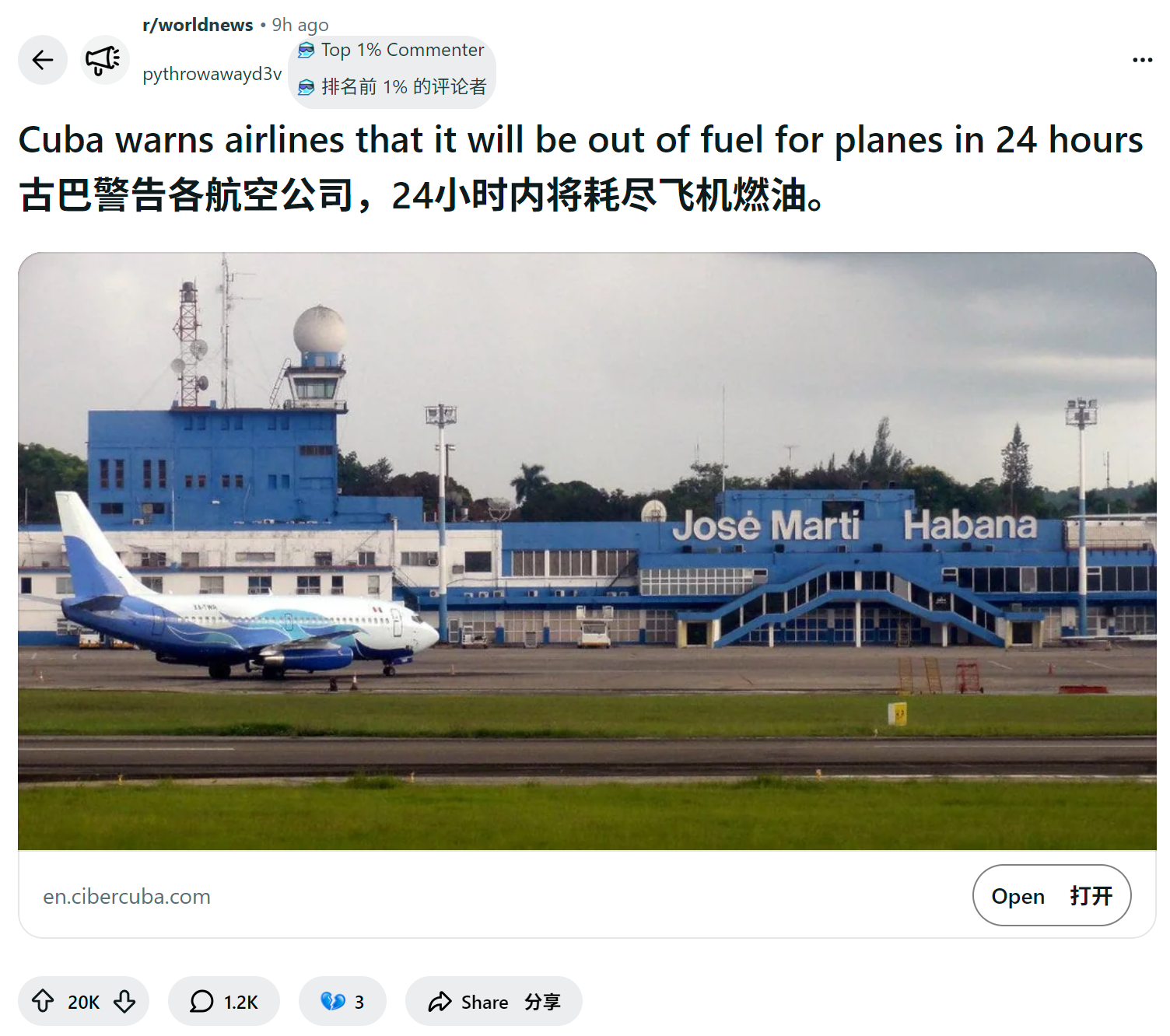 reddit爆火 古巴警告各航空公司,24小时内将耗尽飞机燃油。