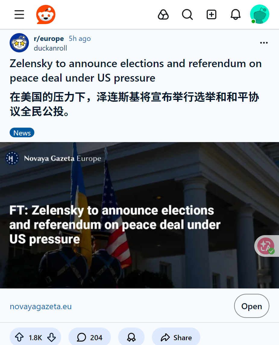 reddit热议 欧洲人怎么看在美国的压力下,泽连斯基将宣布举行选举和和平协议全民公投