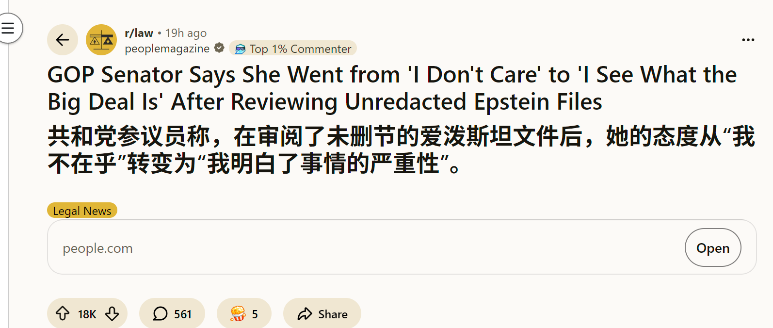 reddit爆火 共和党参议员称,在审阅了未删节的爱泼斯坦文件后,她的态度从“我不在乎”转变为“我明白了事情的严重性”。