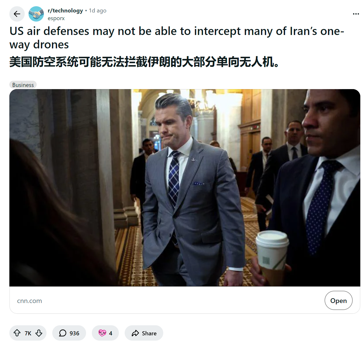 redddit热议 美国防空系统可能无法拦截伊朗的大部分单向无人机。