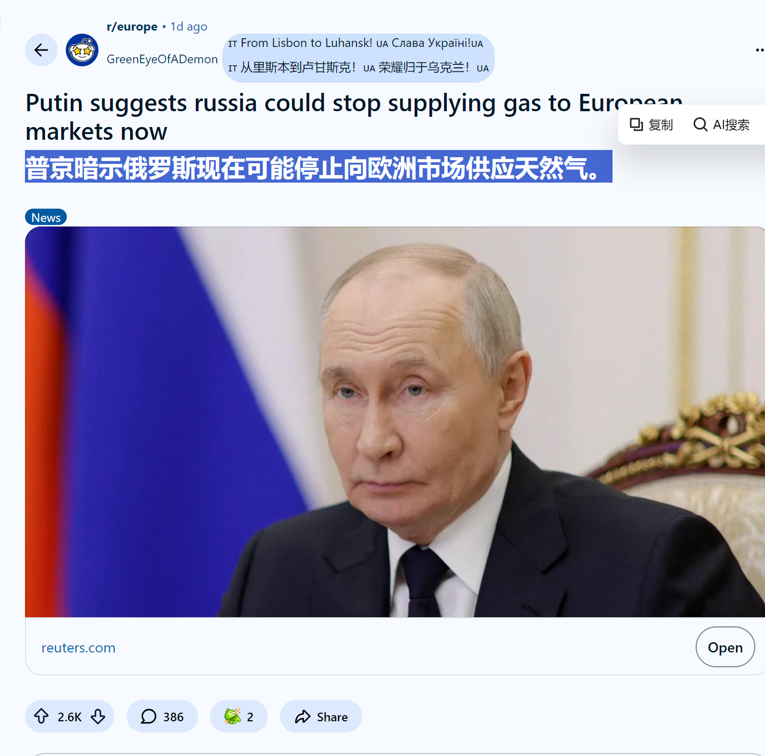 reddit热议 欧洲人怎么看普京暗示俄罗斯现在可能停止向欧洲市场供应天然气。