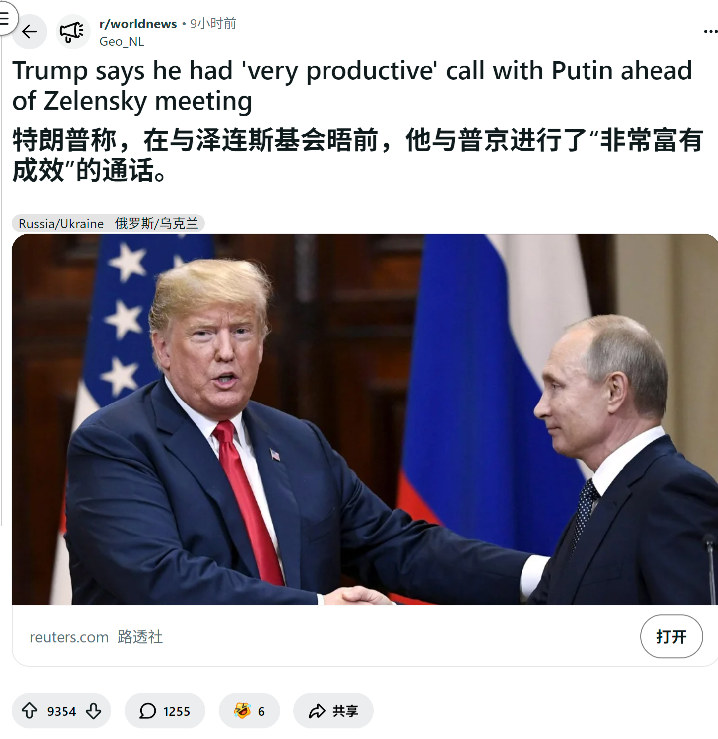 reddit热议 特朗普称,在与泽连斯基会晤前,他与普京进行了“非常富有成效”的通话。
