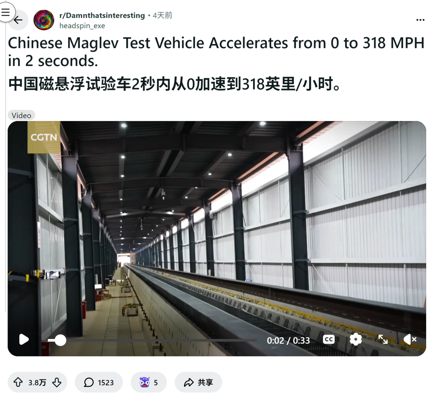 reddit爆火 中国磁悬浮试验车2秒内从0加速到318英里/小时。