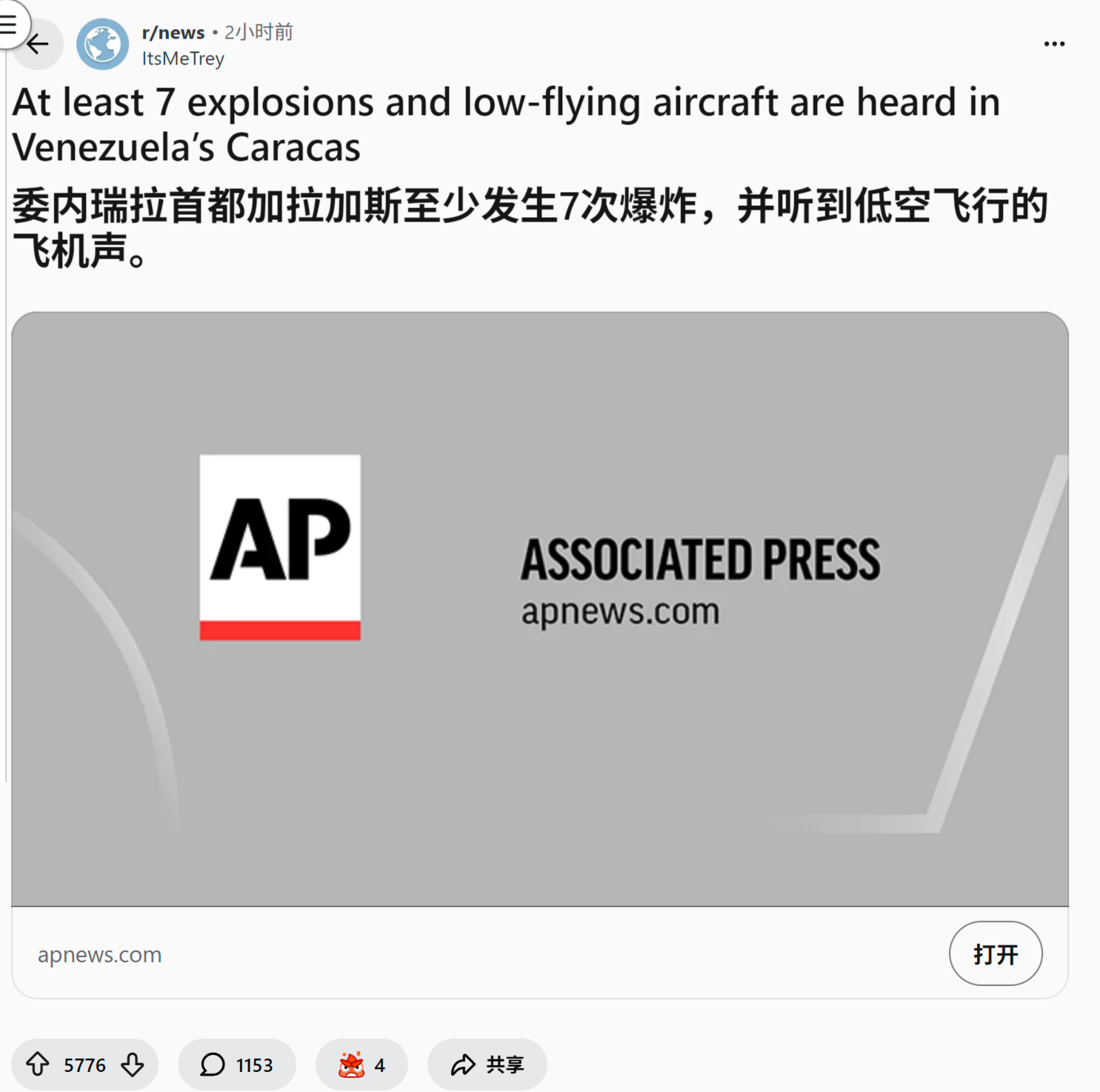 reddit爆火 美国人怎么看委内瑞拉首都加拉加斯至少发生7次爆炸,并听到低空飞行的飞机声。