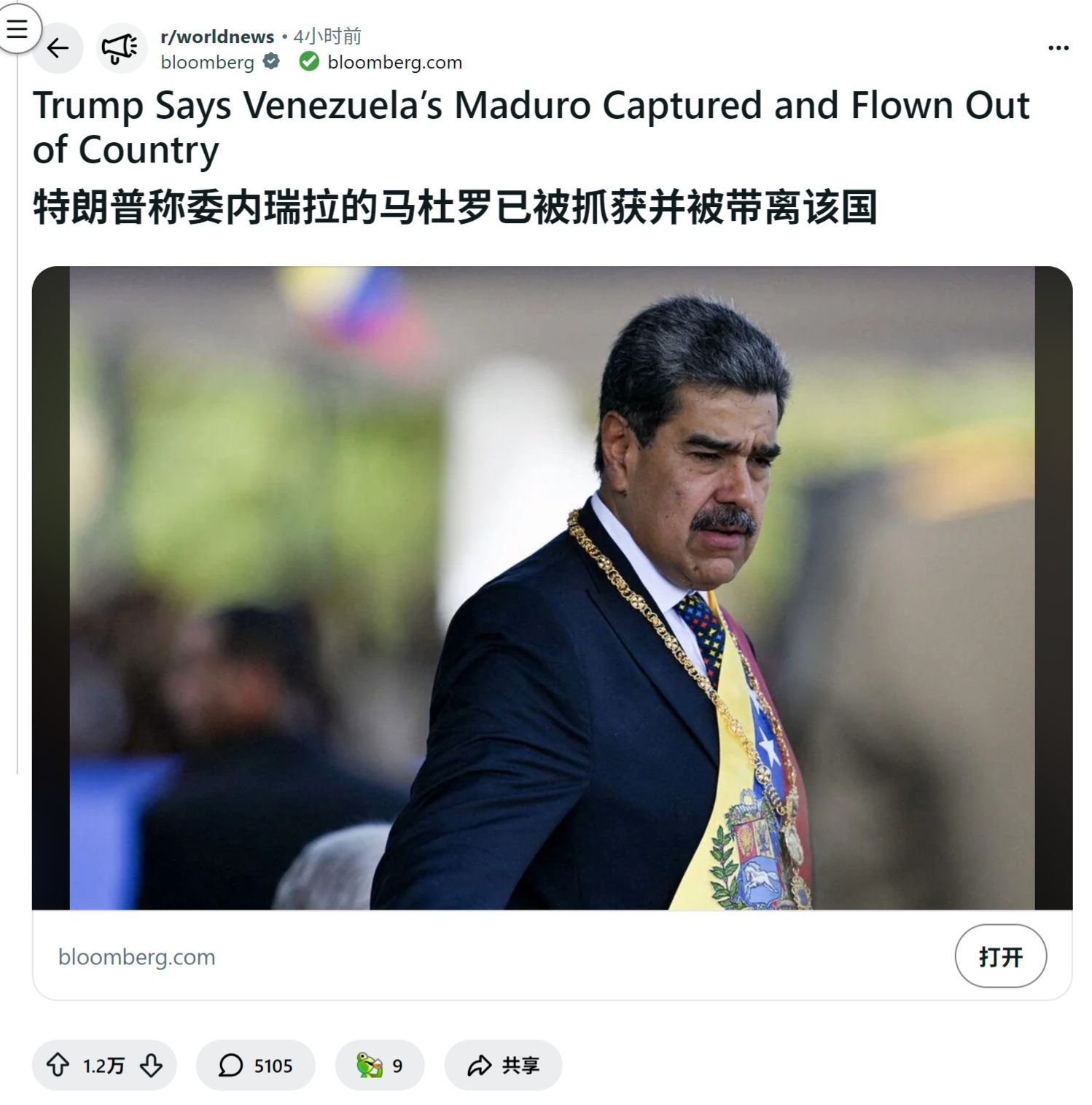 来源:https://www.reddit.com/r/worldnews/comments/1q2qfdr/trump_says_venezuelas_maduro_captured_and_flown/