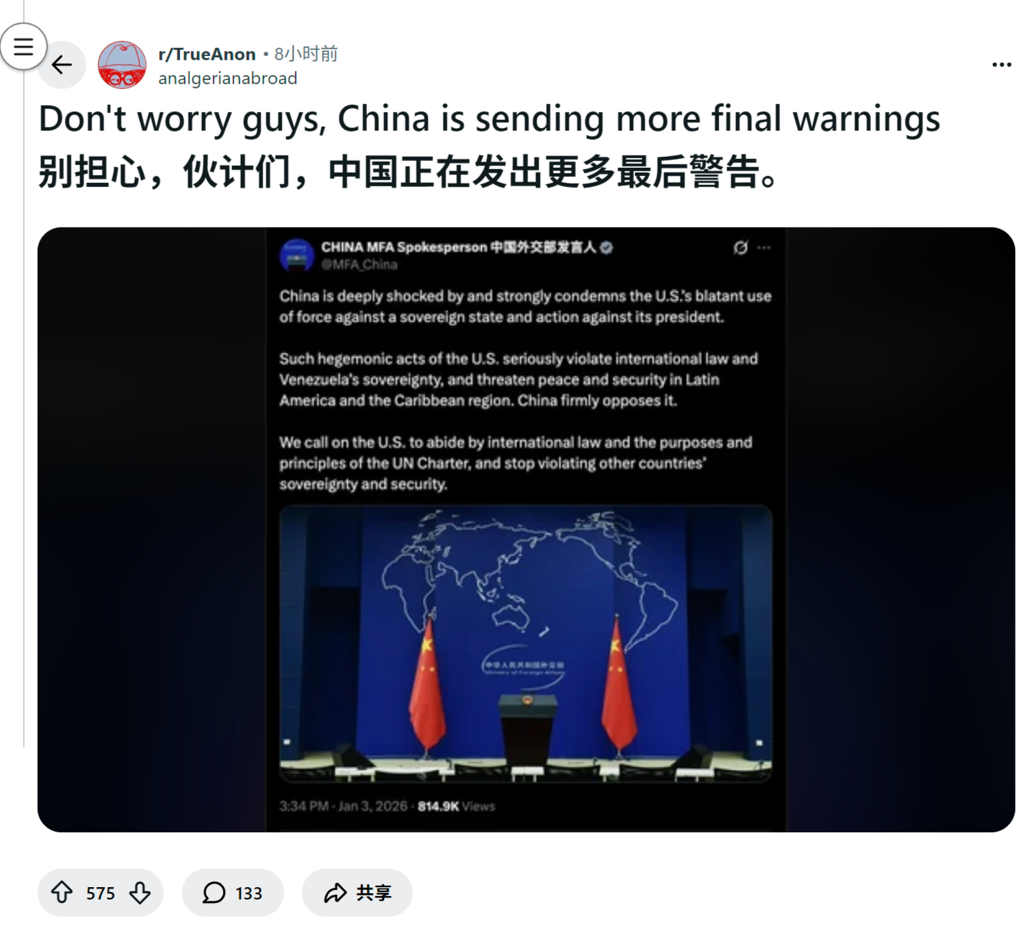 reddit热议 别担心,伙计们,中国正在发出更多最后警告。