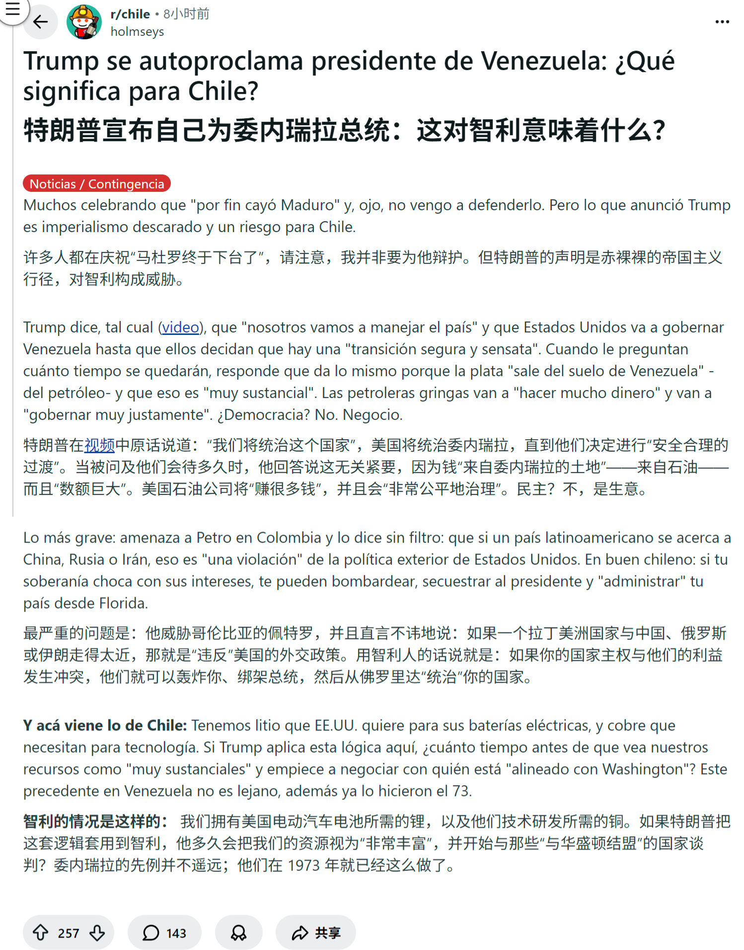 许多人都在庆祝“马杜罗终于下台了”,请注意,我并非要为他辩护。但特朗普的声明是赤裸裸的帝国主义行径,对智利构成威胁。
