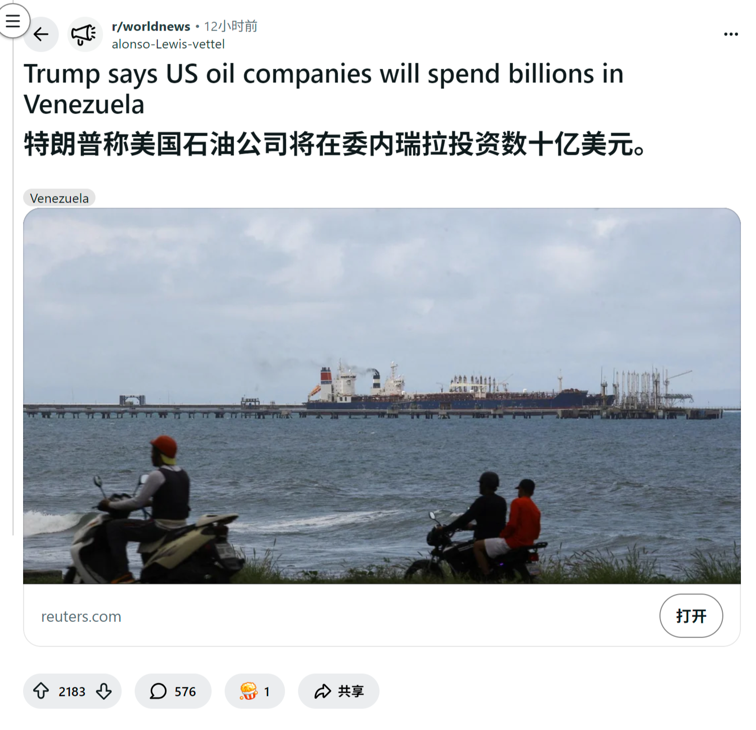 reddit爆火 美国人怎么看特朗普称美国石油公司将在委内瑞拉投资数十亿美元。