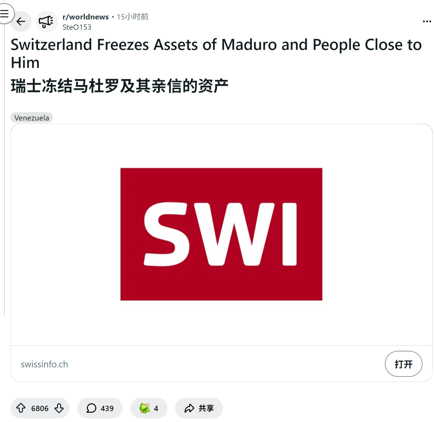 来源:https://www.reddit.com/r/worldnews/comments/1q4ns4t/switzerland_freezes_assets_of_maduro_and_people/