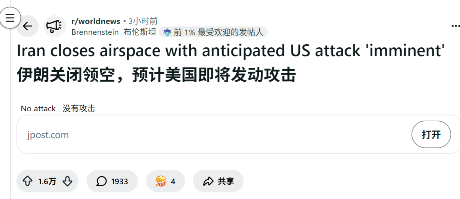 reddit爆火 老外怎么看伊朗关闭领空,预计美国即将发动攻击