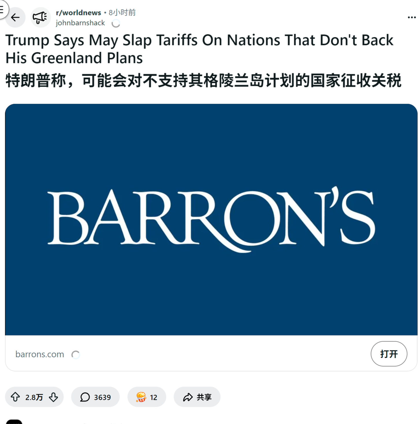 - reddit热议 因格陵兰岛欧盟正考虑对美国征收1080亿美元的报复性关税