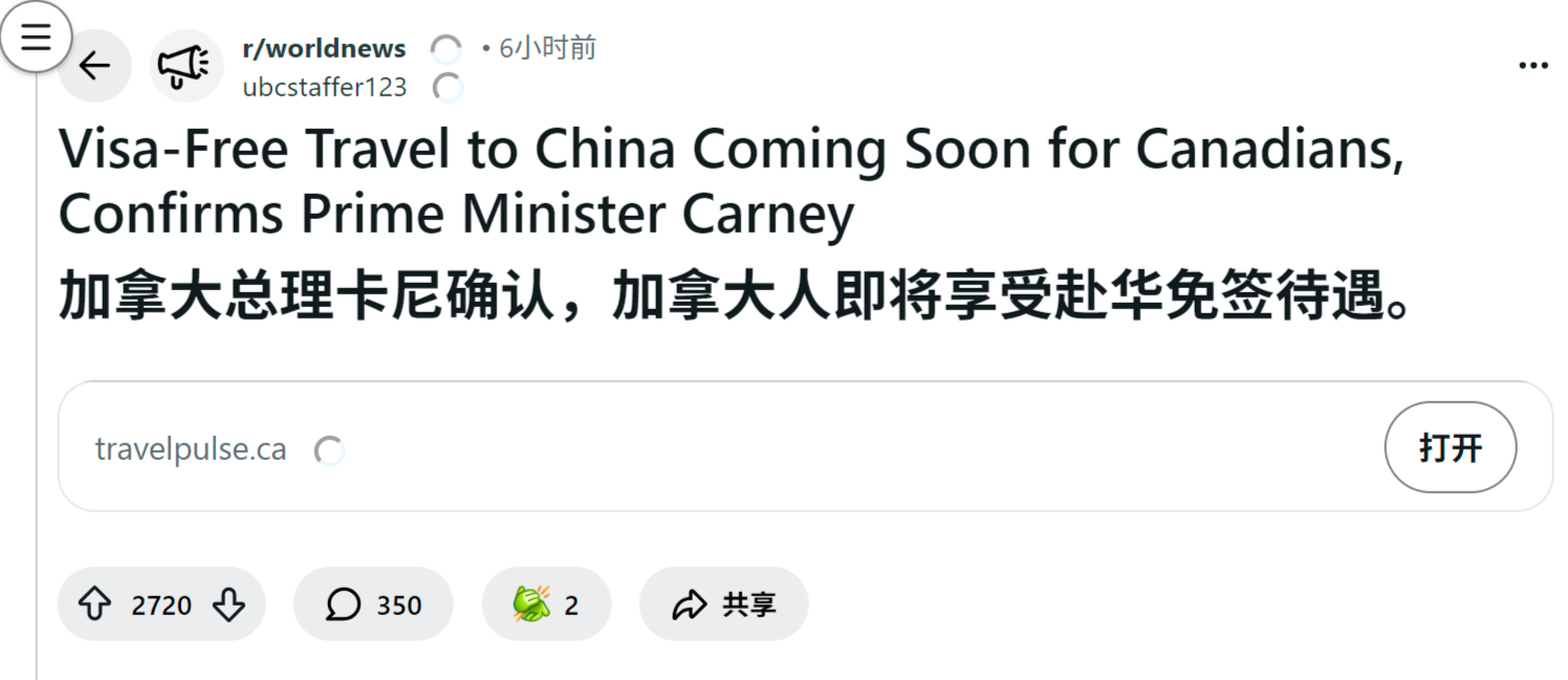 reddit热议 老外怎么看加拿大总理卡尼确认加拿大人即将享受赴华免签
