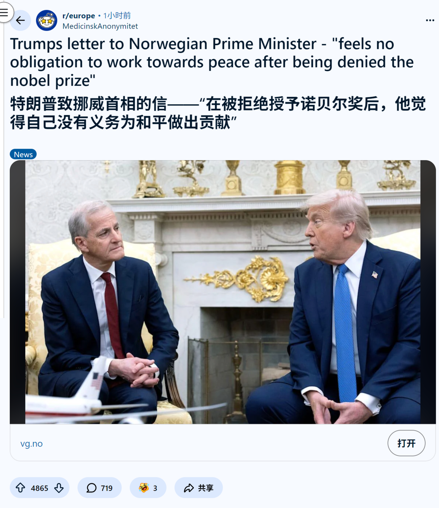 来源:https://www.reddit.com/r/europe/comments/1qgyjdg/trumps_letter_to_norwegian_prime_minister_feels/