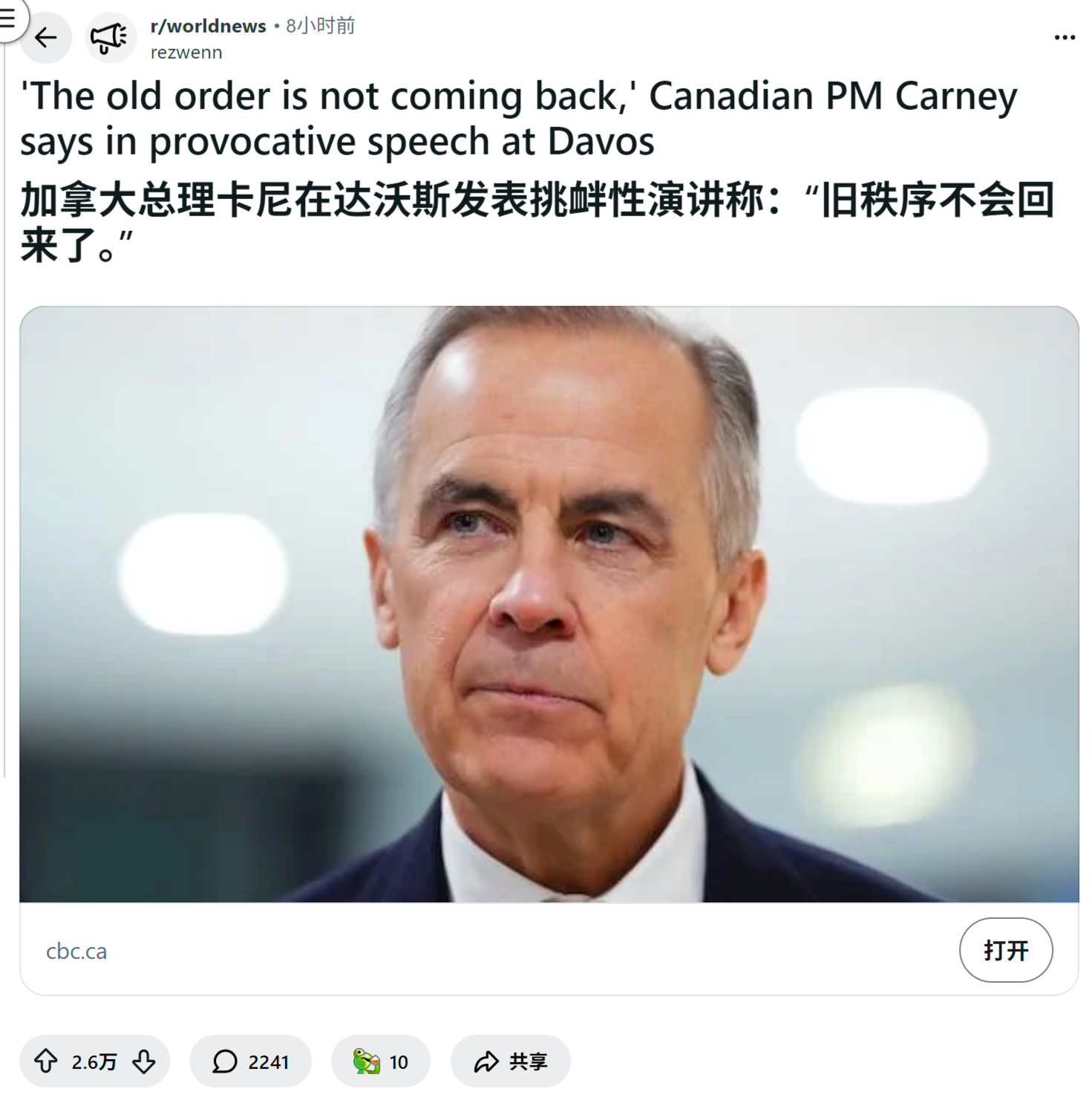 来源:https://www.reddit.com/r/worldnews/comments/1qi4wtk/the_old_order_is_not_coming_back_canadian_pm/