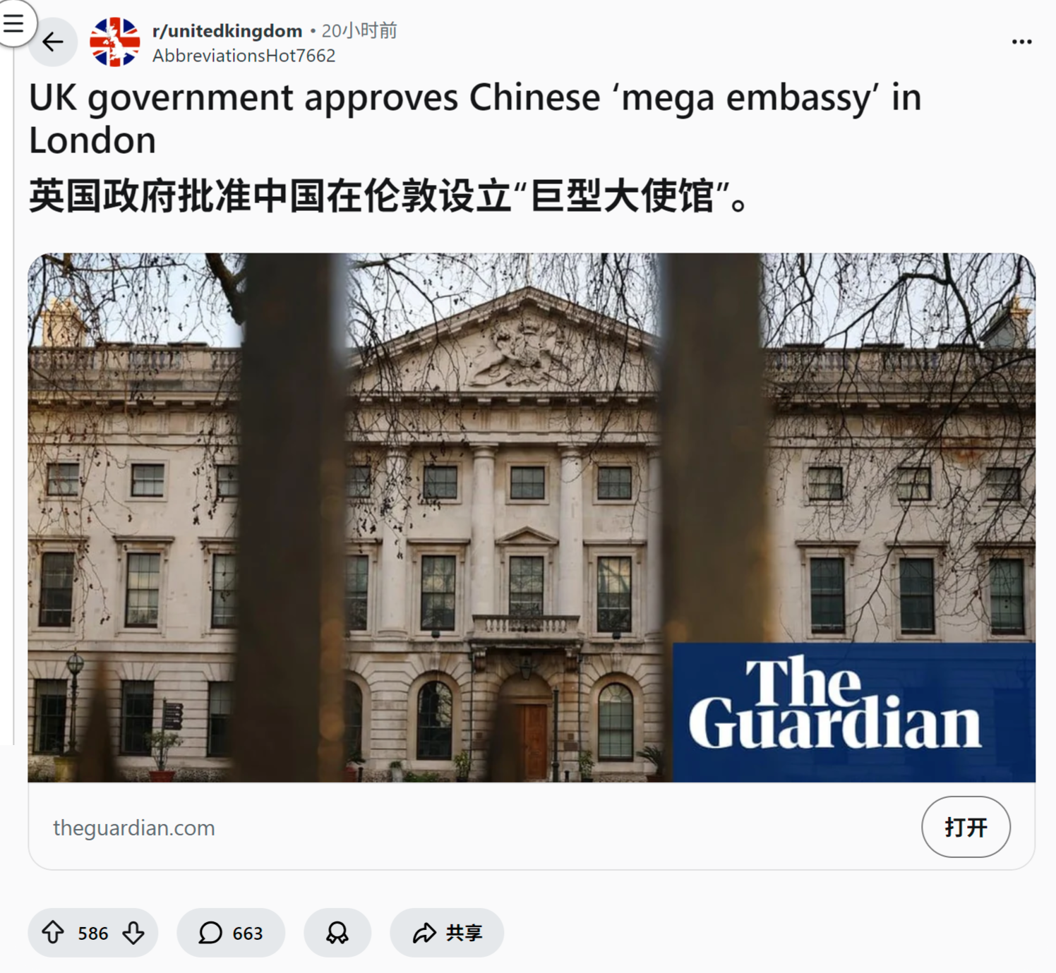 reddit爆火 英国人怎么看英国政府批准中国在伦敦设立“巨型大使馆”。
