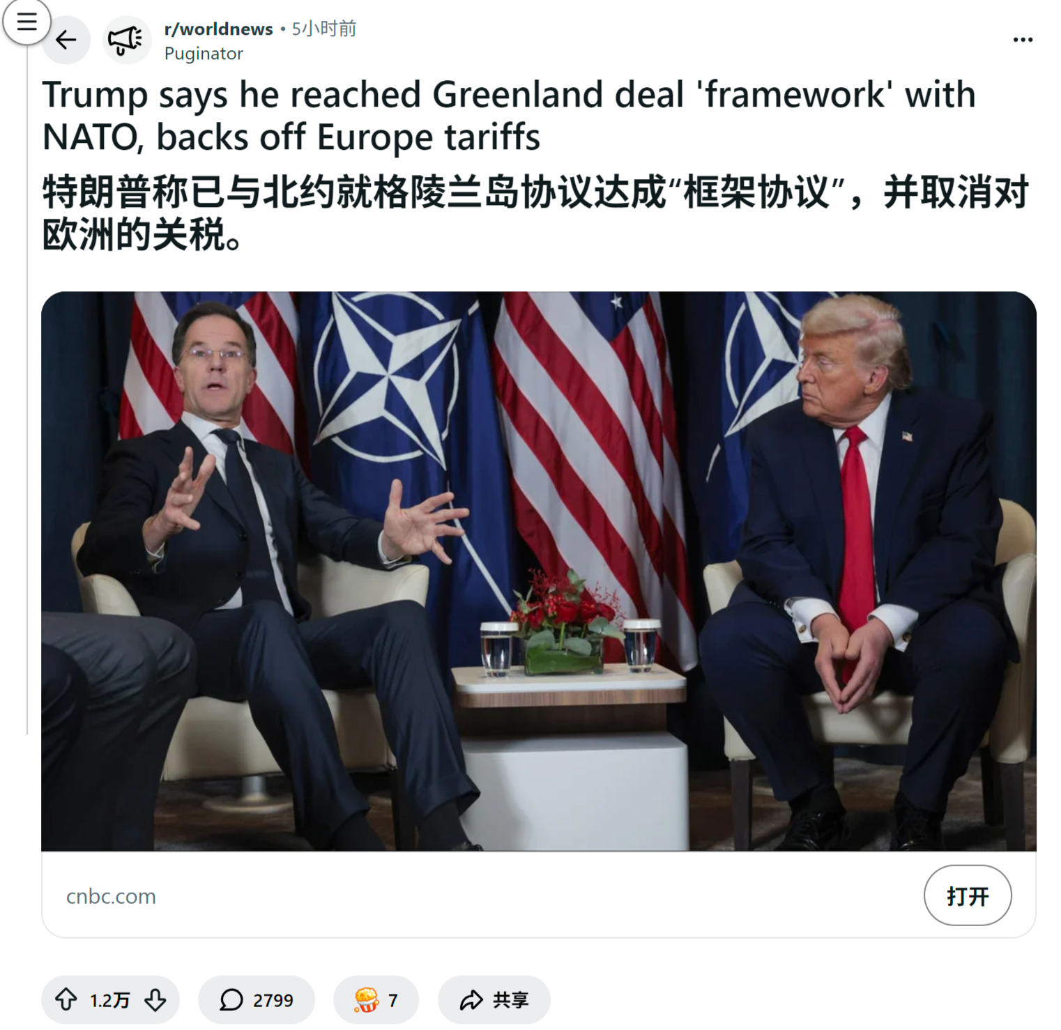 来源:https://www.reddit.com/r/worldnews/comments/1qj7rdk/trump_says_he_reached_greenland_deal_framework/