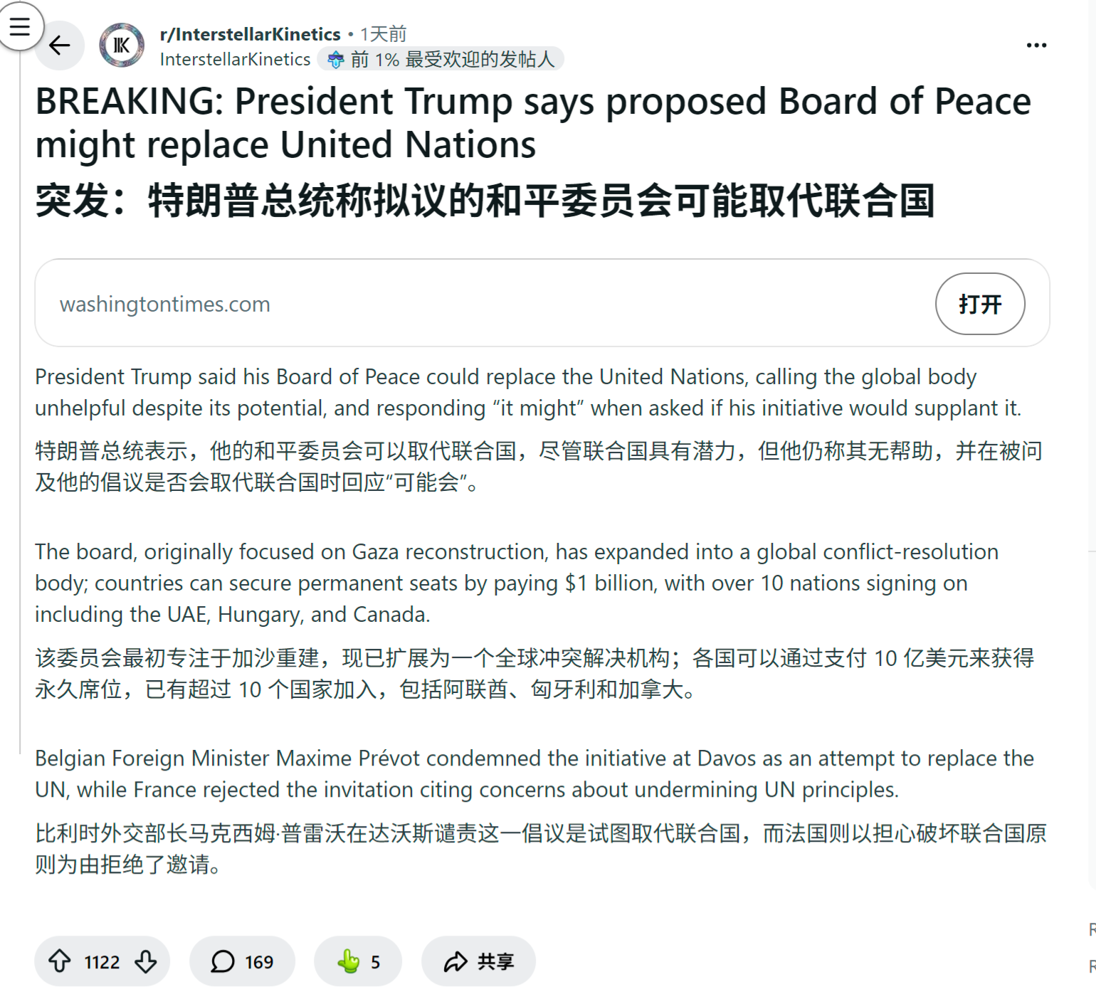 reddit热议 老外怎么看特朗普总统称拟议的和平委员会可能取代联合国