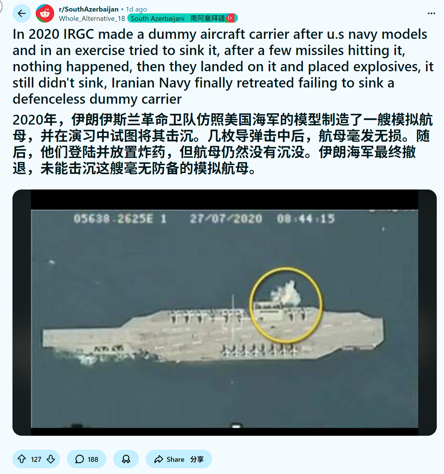 reddit热议 伊朗伊斯兰革命卫队仿照美国海军的模型制造了一艘模拟航母,并在演习中试图将其击沉。