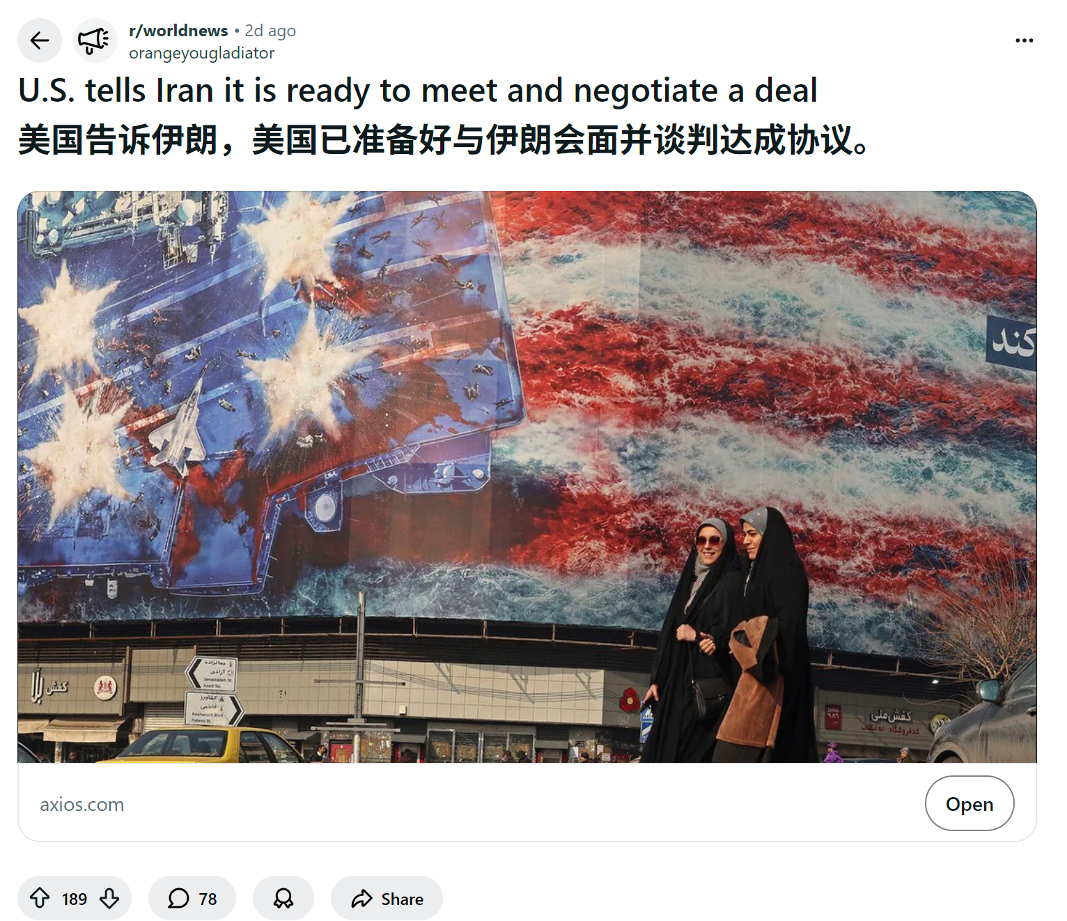 reddit热议 美国告诉伊朗,美国已准备好与伊朗会面并谈判达成协议。