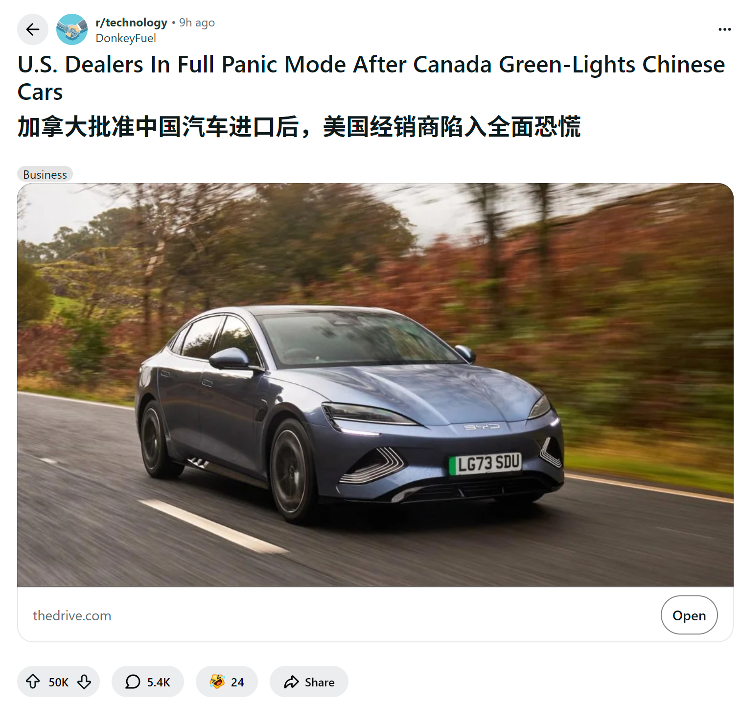 reddit爆火 老外怎么看加拿大批准中国汽车进口后,美国经销商陷入全面恐慌