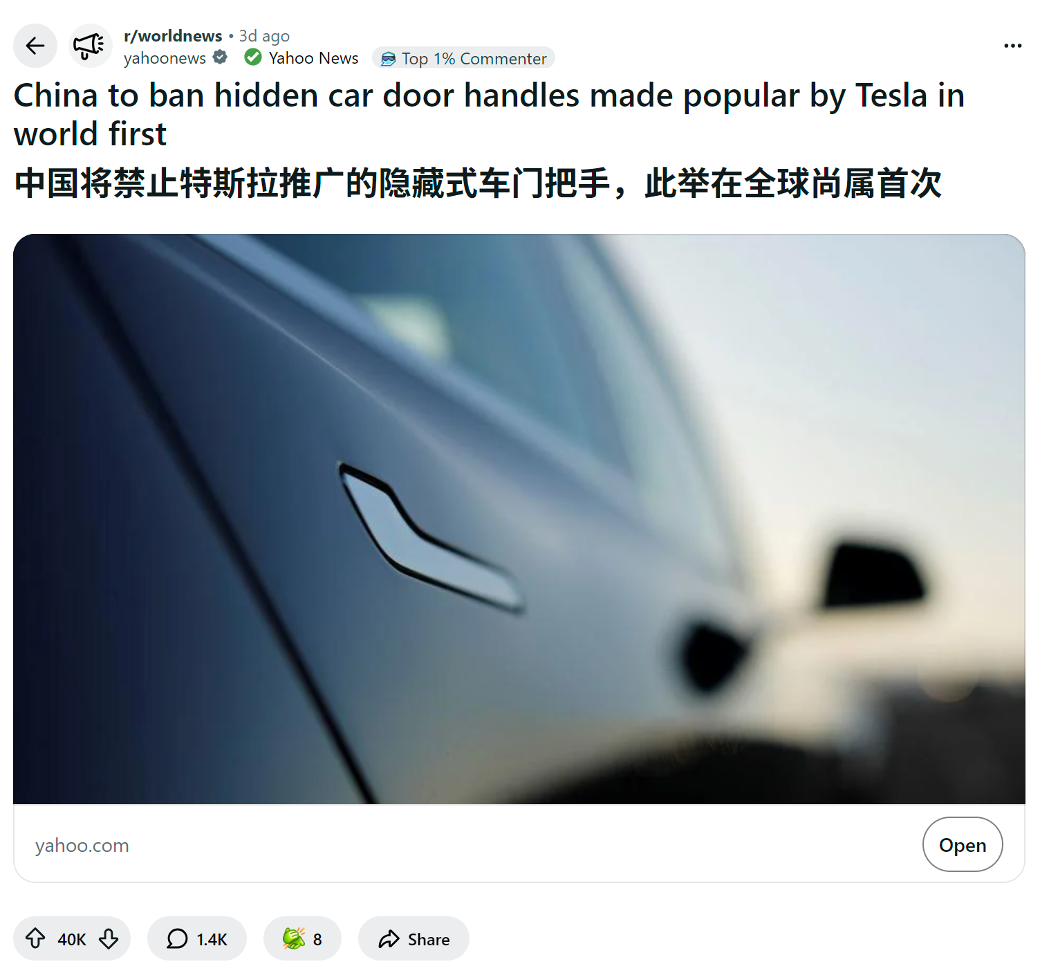 reddit爆火 老外怎么看中国将禁止特斯拉推广的隐藏式车门把手,此举在全球尚属首次