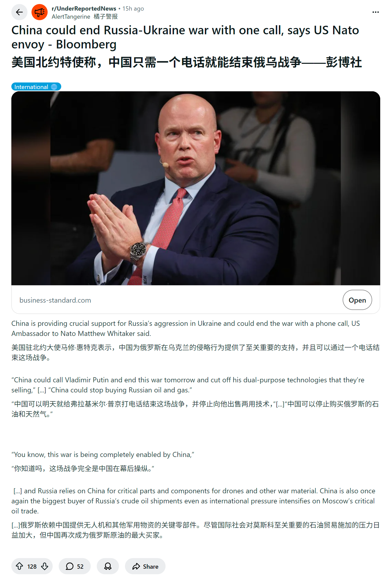 reddit热议 老外怎么看美国北约特使称,中国只需一个电话就能结束俄乌战争