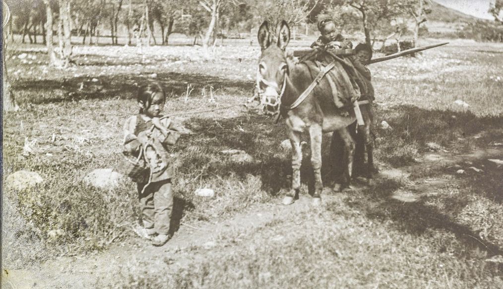 田间地头,一位看上去只有五六岁的小女孩正牵着一头毛驴赶路,驴子背上还趴着一个小男孩,后面还跟着一个男孩。在那个年代,往往都是小小年纪就挑起了生活的重担。